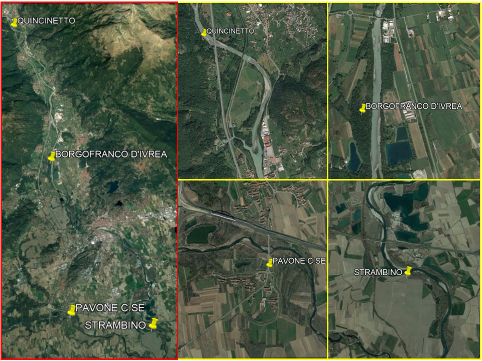 DORA BALTEA: Borgofranco d'Ivrea (45.498628, 7.837413), Strambino (45.414871, 7.911784) e Quincinetto (45.580871, 7.798355);