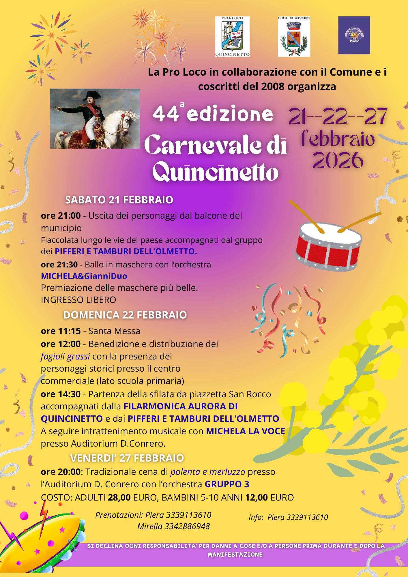 Ore 14:30 partenza della sfilata da Piazzetta San Rocco accompagnati dalla Filarmonica Aurora di Quincinetto e dai Pifferi e Tamburi dell'Olmetto. A seguire, intrattenimento musicale con Michela La Voce presso l'Auditorium Dante Conrero.
