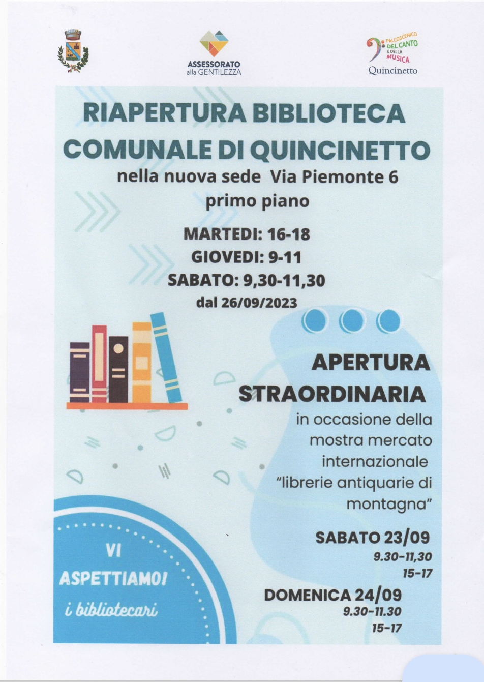 Riapertura della Biblioteca Comunale in via Piemonte 6 dal 26/09/2023