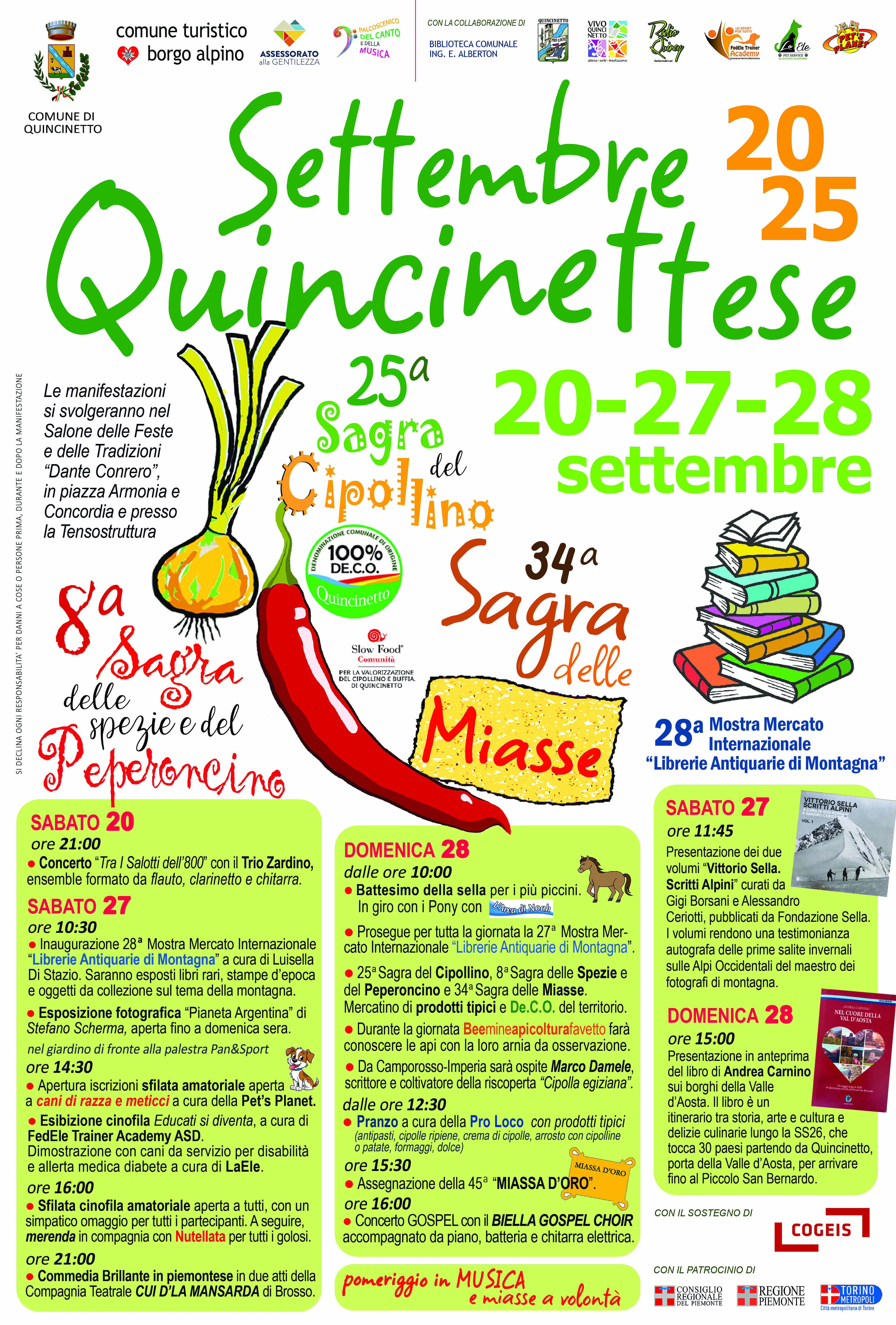 In allegato il programma di "Settembre Quincinettese 2025" che si svolgerà nei giorni di sabato 20, sabato 27 e domenica 28 settembre 2025 con i dettagli sulla 34° Sagra delle Miasse, la 25° Sagra del Cipollino e l'8° Sagra delle Spezie e del Peperoncino.
